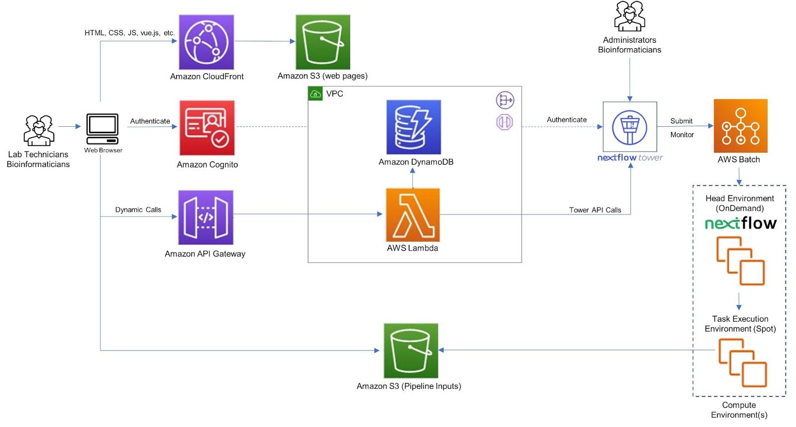 Laboratorians access Easy Genomics using the web browser, upload the sequencing data, select the workflow and submit it for processing. Behind the scenes, Easy Genomics interfaces with Nextflow Tower APIs for processing the workflows and upload the results back to an Amazon S3 Bucket.