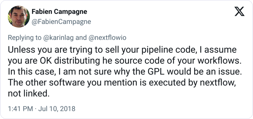 No. We are aware that this is not enough and the GPL licence can impose some limitation in the usage of Nextflow to some users and organizations. For this reason we are working with the CRG legal department to move Nextflow to a more permissive open source license. This is primarily motivated by our wish to make it more adaptable and compatible with all the different open source ecosystems, but also to remove any remaining legal uncertainty that using Nextflow through linking with its functionality may cause.