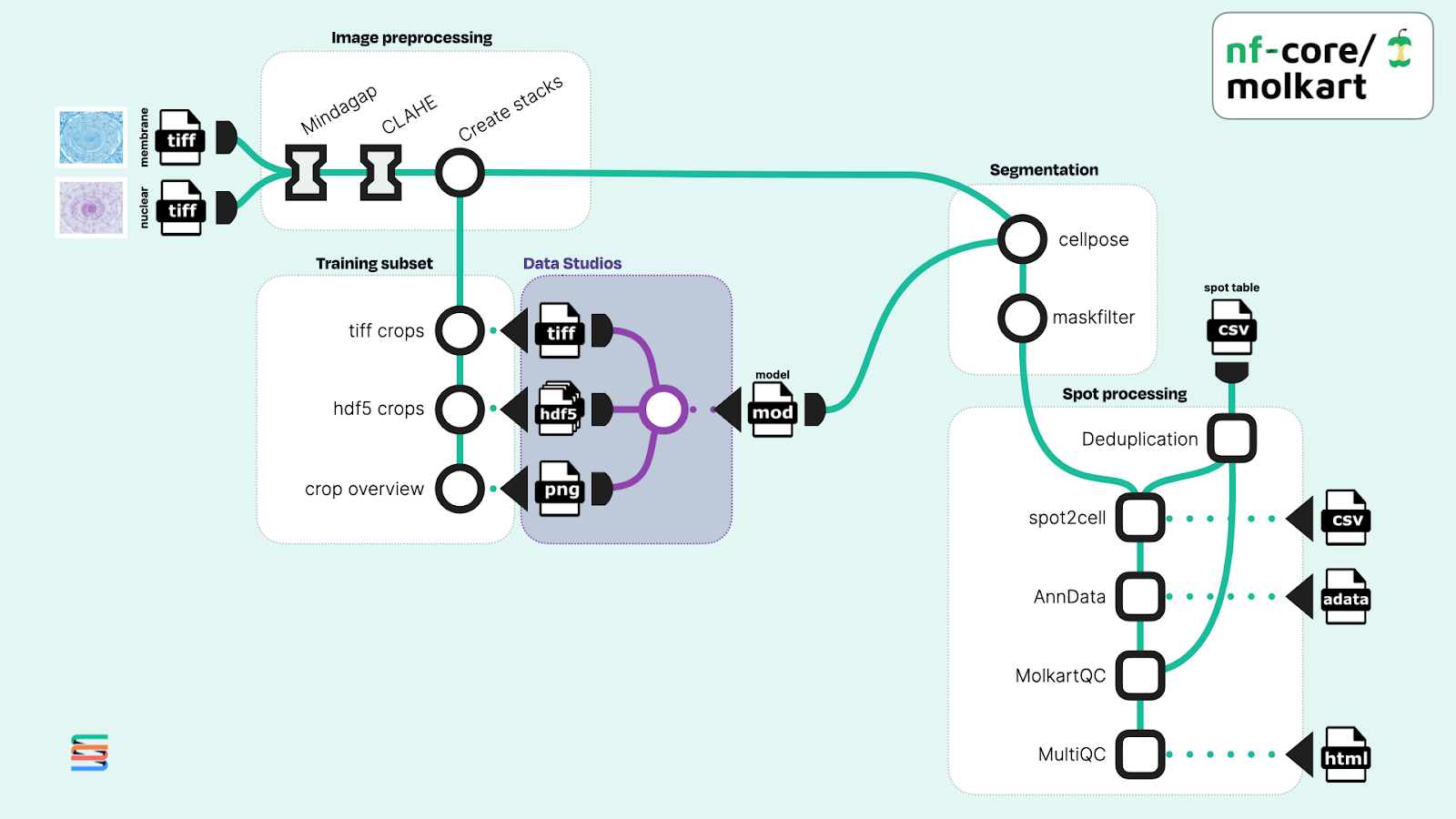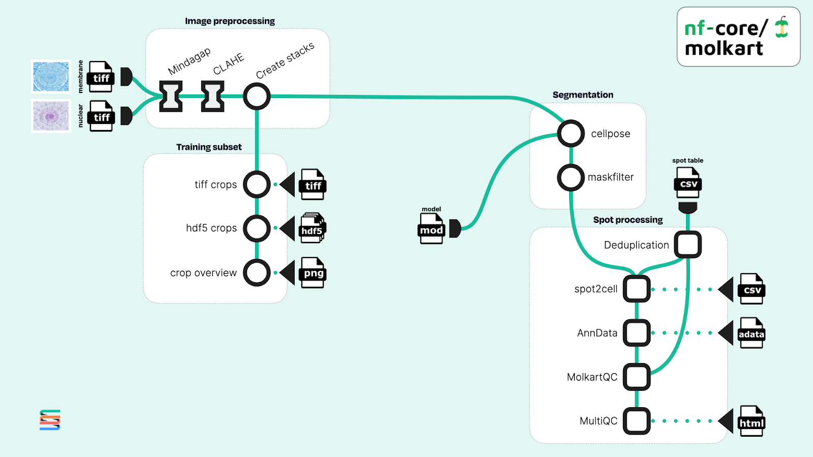 Figure 1. Adapted workflow diagram of the nf-core/molkart pipeline for processing molecular cartography data using Nextflow. Original image data shown was taken from the literature (Perico et al.).