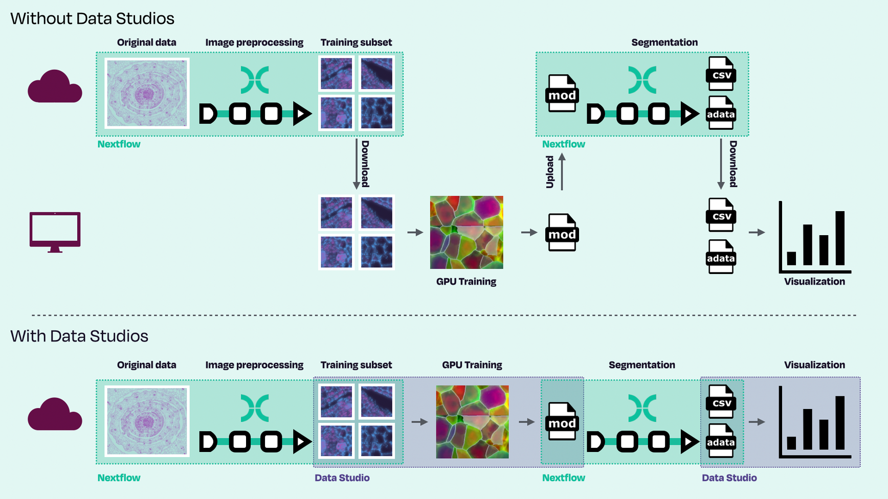 Figure 3. Schematic workflow of image segmentation using nf-core/molkart with (bottom) and without (top) Studios. Original image data shown was taken from the literature (Perico et al.).