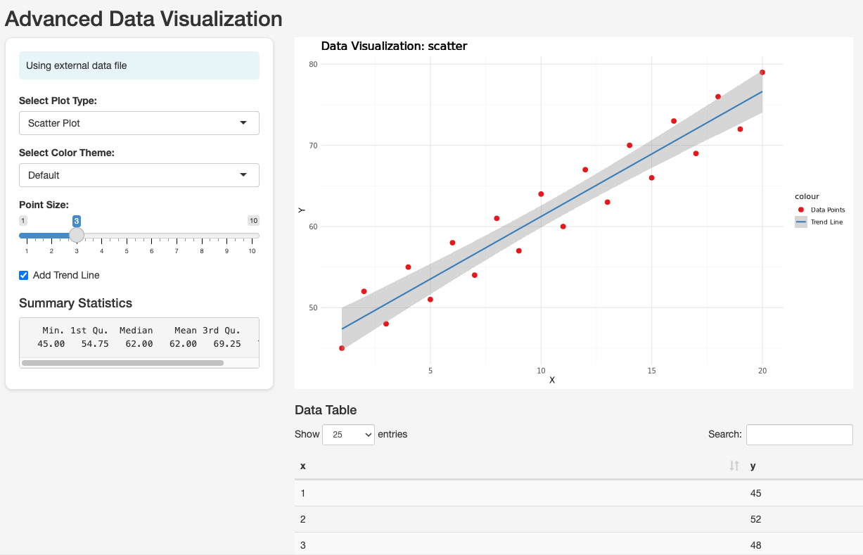 At runtime, the Shiny application will start, referencing the file provided via a data link. Anyone in the associated Platform workspace can access the application, and will have their own private sessions.