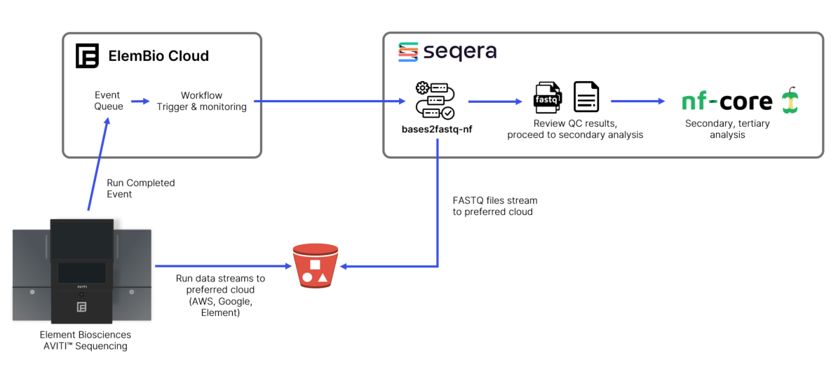 Fortunately, the Element Bio team has been hard at work and recently announced a more robust integration with the Seqera Platform. The new integration is implemented as a feature of ElemBio Cloud, an online platform used to manage AVITI instruments, monitoring runs, visualizing data, and managing team members. A high-level illustration of the workflow is provided below.