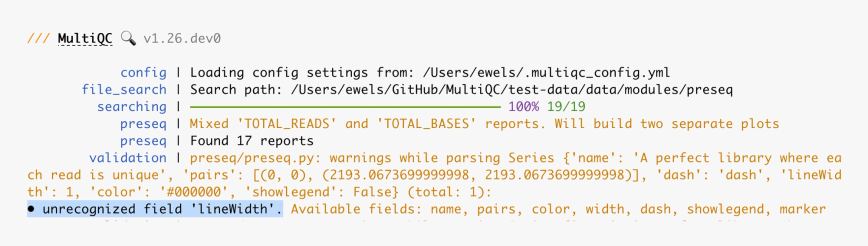 Version 1.22 brought some major behind-the-scenes refactoring to MultiQC. These changes enable MultiQC to be used as a library within scripts. It adds another way to customize report content beyond “Custom Content” and MultiQC Plugins, as you can now dynamically inject data, filter, and customize report content within a script. Ideal for use within analysis pipelines!