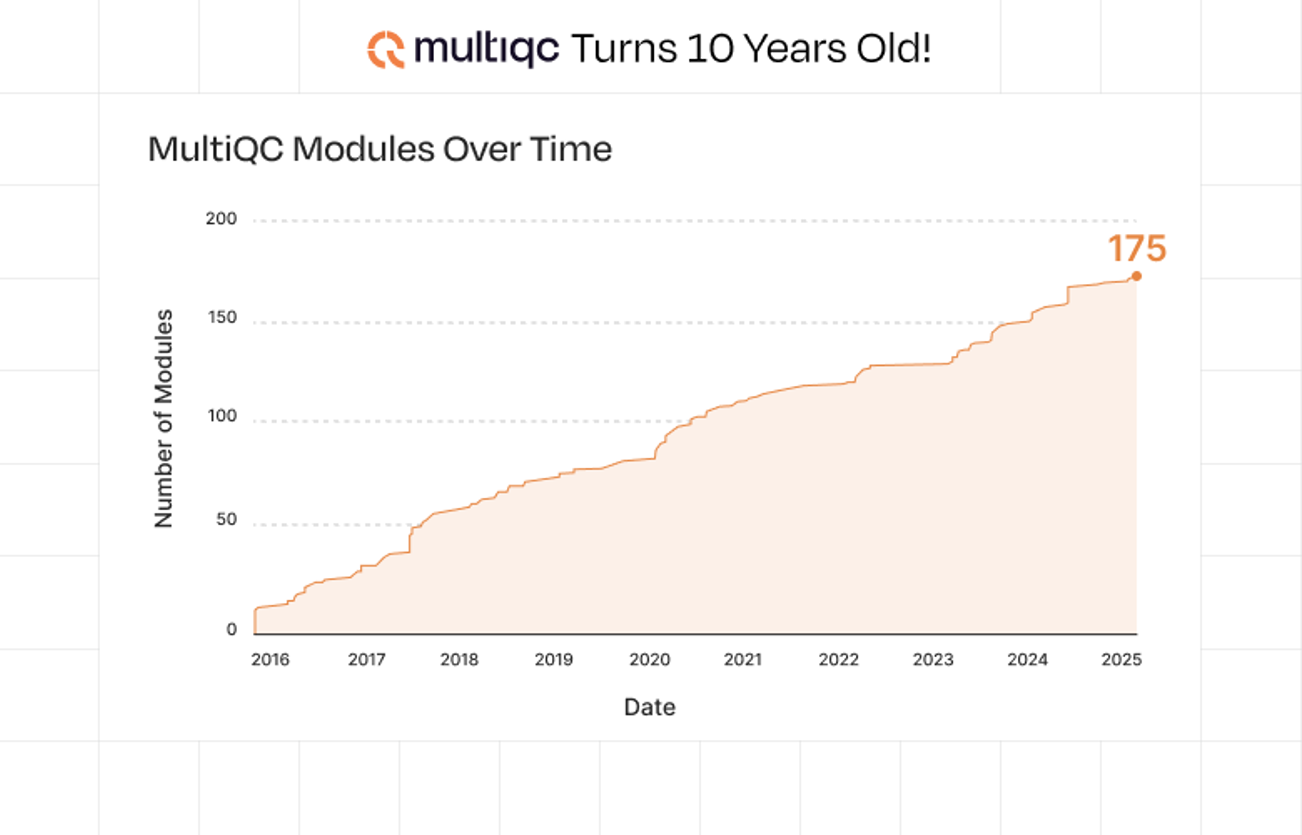 As we celebrate this 10-year milestone, I'm excited about what the future holds. Recent achievements showcase the continued evolution and community impact of MultiQC. The tool now supports nearly 170 different bioinformatics tools - a testament to both the diverse ecosystem it serves and the active contribution from our community. MultiQC has evolved from a collection of scrappy reporting scripts into a cornerstone of modern bioinformatics, and this journey is far from over.