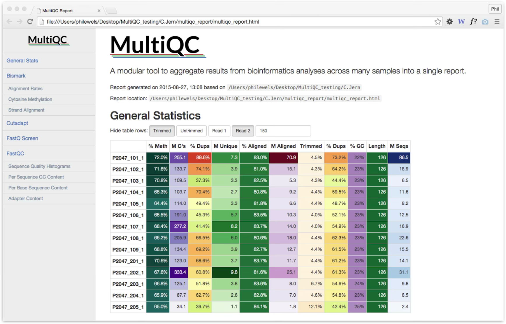 Very few tools come out of nowhere, and MultiQC was no exception. I had a split background of web development as a hobby and bioinformatician as a day job. Visualization of data was an obvious route and projects as far as back as 2012 I was writing Perl scripts to create HTML summary reports from bioinformatics tools (one for Bismark wound up being pulled into bismark2report, another ended up in HiCUP, others for bowtie and tophat were lost to the mists of time). When joining SciLifeLab NGI there was an obvious need for similar visualizations and more one-off scripts flourished. The closest to what we’d now recognise as MultiQC was a planned module for the internal LIMS “genomics-status”. This had an overview table of key statistics and a way to quickly key through FastQC plots for each sample.