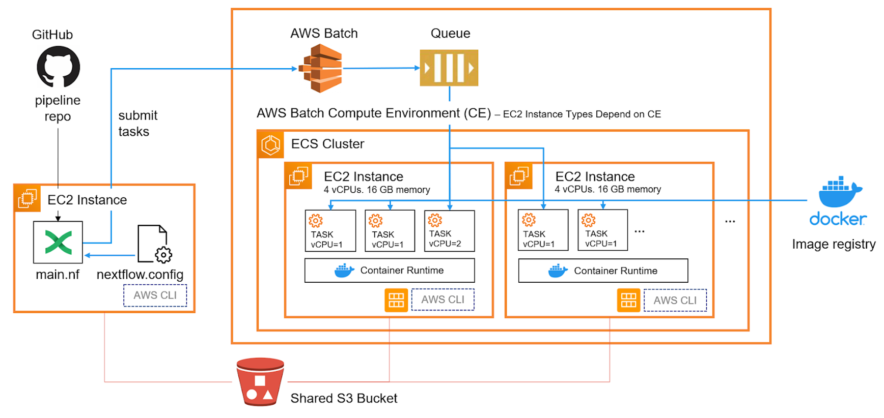 From the perspective of a Nextflow user, pipelines run as they always do. The Nextflow AWS Batch integration handles all the details including staging data in S3, creating AWS Batch job definitions, ensuring that any Docker images needed for containerized execution are available on ECS cluster nodes, and retrieving results from AWS Batch as inputs to the next step in a Nextflow pipeline.
