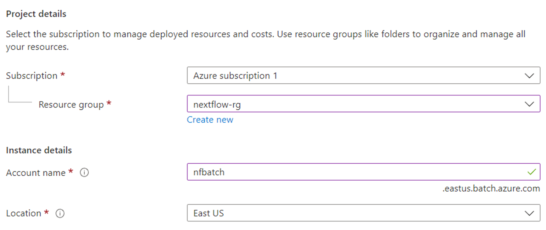 4. Azure uses the term "Project" to describe a new deployment of the Batch Service. Enter details about your project as shown. If you don’t have an Azure resource group to associate the service with, you can create one on the fly.