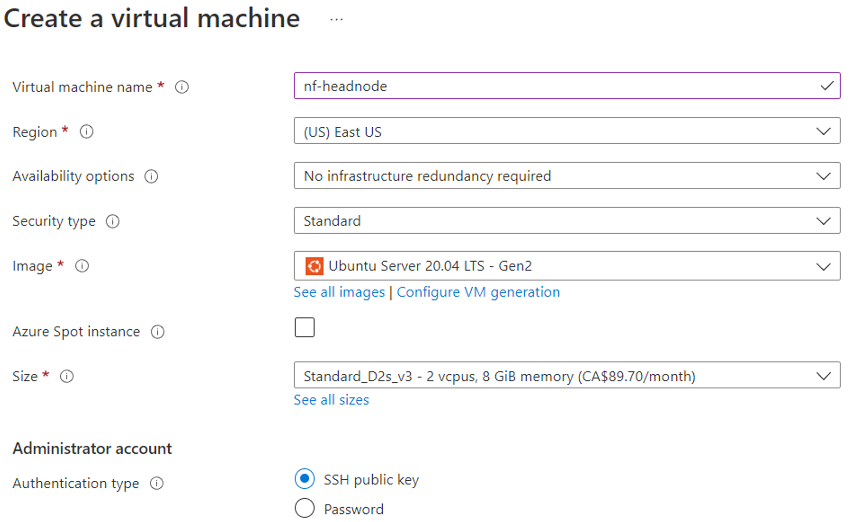 Give the VM a name (nf-headnode in our example), and select the same region where you’ve installed Azure Batch and your storage account. You can select your preferred operating environment to run on this cloud instance. Ubuntu Server 20.04 LTS is a good choice. You can also select an appropriately sized VM. For testing, we can use a small VM with 2 vCPUs as shown. For a larger environment, where multiple users may share the same VM to execute pipelines, select a VM with more resources.