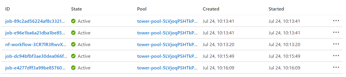 The Jobs view within the Azure Batch console shows how the Nextflow tasks map to Azure Batch jobs. The Azure Batch integration submits the pipeline itself as a batch job (head job). The pipeline job is shown as "nf-workflow-..." in the job listing below. The pipeline job submits additional batch jobs (child jobs) for each task in the Azure pipeline as tasks become ready to run. The Azure batch job IDs (below) correspond to the native_id visible from within the Tower interface above.