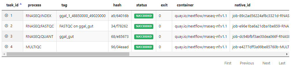 Tower also details the various tasks comprising pipeline execution. For each task, Tower displays the task_id, the process, and other details such as job status and the container used to execute the task. Users can drill down to task-level details and see the command executed, the working directory, and the PATH settings. Users can also access stdout, stderr, and the logfile associated with each task to aid in troubleshooting.