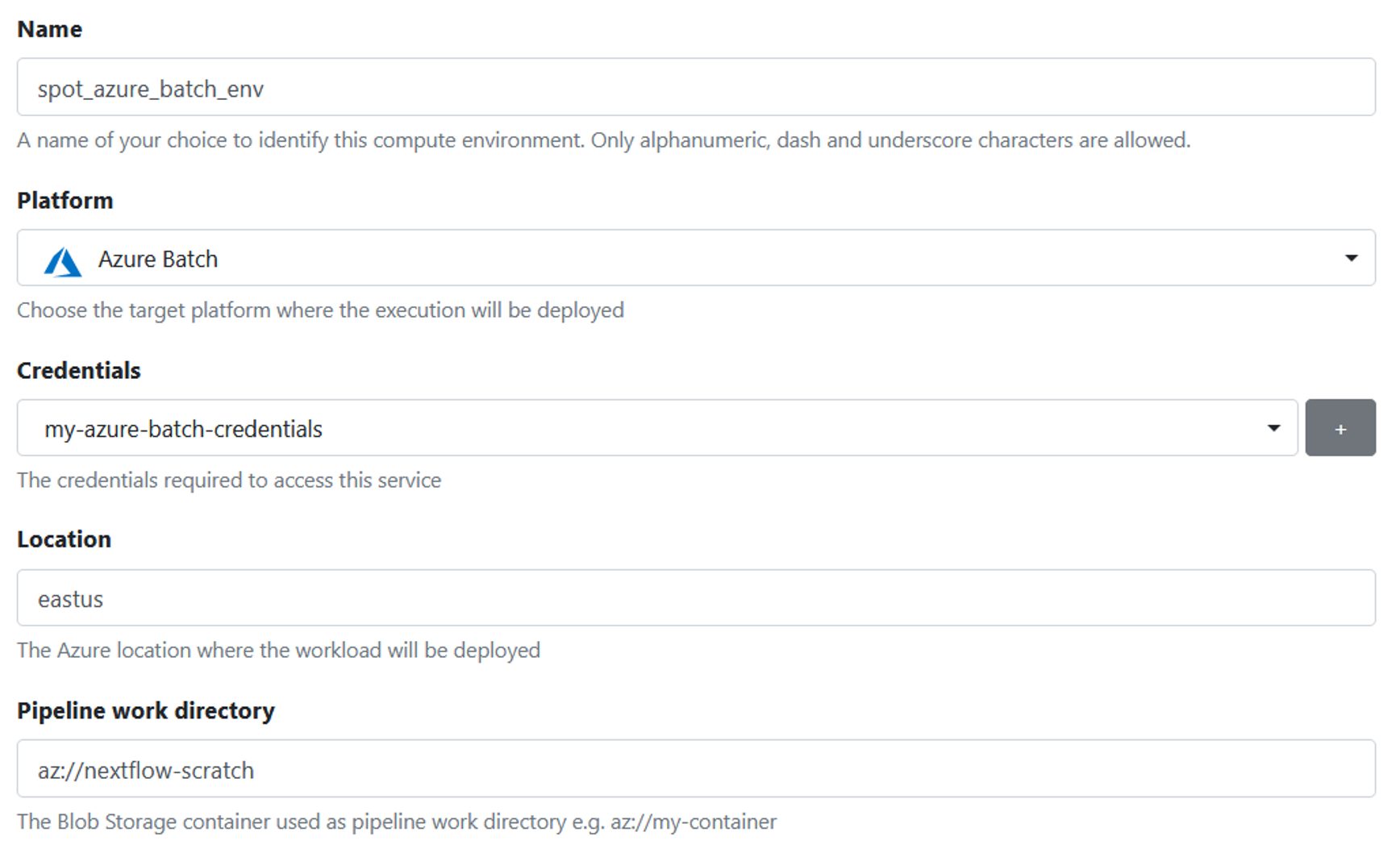 Configuring a new compute environment is done entirely through the Tower web interface. Even non-technical users can easily configure an Azure Batch environment assuming they have the required credentials and be up and running in a matter of minutes.