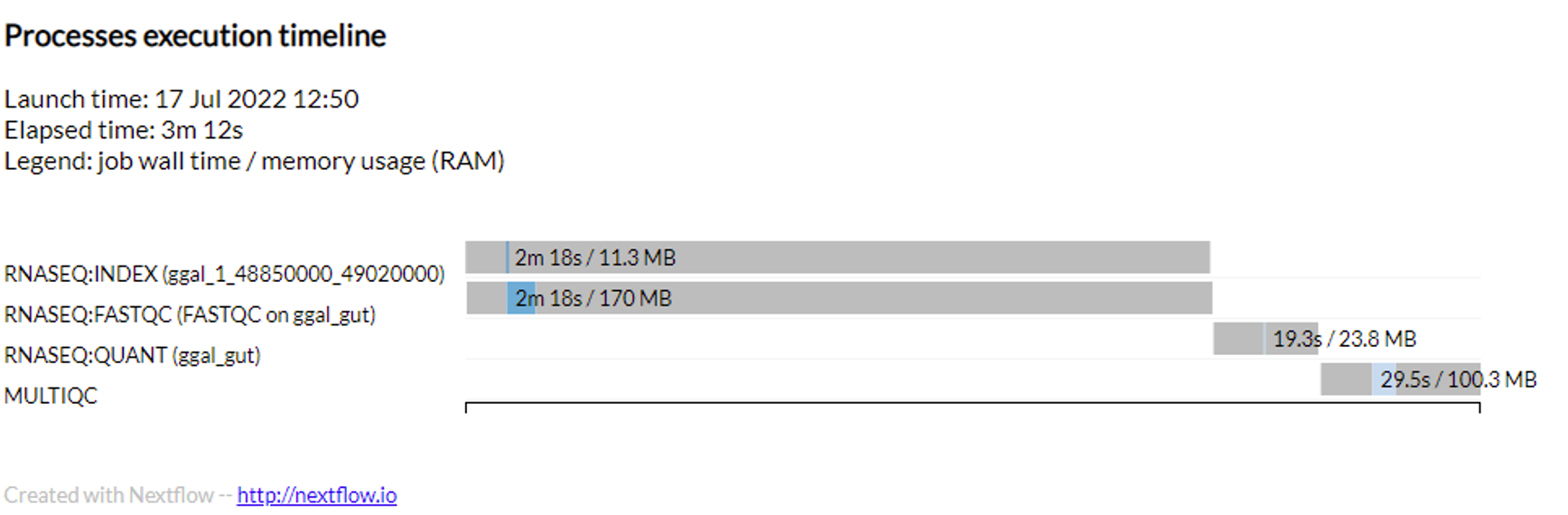A sample of the timeline report available from the Execution log is provided below. Users can see the elapsed time for each task (the wall time) and the total amount of memory consumed. This information can help optimize the selection of VM types in different compute environments depending on pipeline requirements.