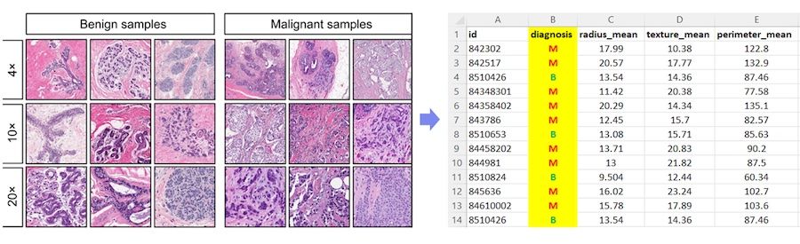 The Wisconsin Diagnostic Breast Cancer (WDBC) dataset is a well-known dataset that is often used as an example for learning or comparing different machine learning techniques, specifically for classification. The dataset consists of 589 samples, and each sample is a set of 30 features taken from an image of a breast tissue. The diagnosis column indicates whether the sample was benign (B) or malignant (M), as illustrated below.