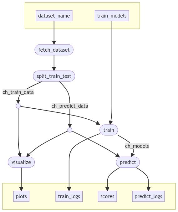 We developed a proof-of-concept pipeline called hyperopt to demonstrate a model training pipeline in Nextflow. The pipeline takes any tabular dataset (or the name of a dataset on OpenML), and trains and evaluates a set of machine learning models on the dataset, reporting the model that achieved the highest test accuracy.