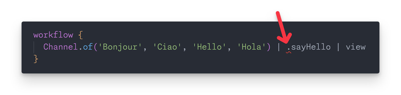 The new "strict syntax" parser is now fully integrated into the Nextflow CLI. An opt-in feature for now, strict syntax enables consistent behavior between the Nextflow CLI and language server, and enables numerous new features. The most obvious benefit is more actionable error messages: the Nextflow CLI now pinpoints the source of errors to precise source-code coordinates, together with output on the terminal highlighting exactly where the problem lies, helping developers and end users alike.