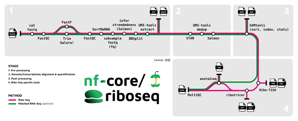 - Pipeline development: Individual components were stitched together coherently to create the nf-core/riboseq pipeline, with its own testing framework and user documentation.