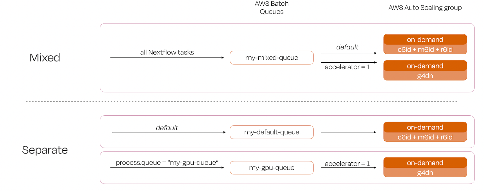 - →Mixed Queue: Both CPU and GPU instances are selected in a single CE, perfect to seamlessly request GPUs using Nextflow’s “accelerator” directive.