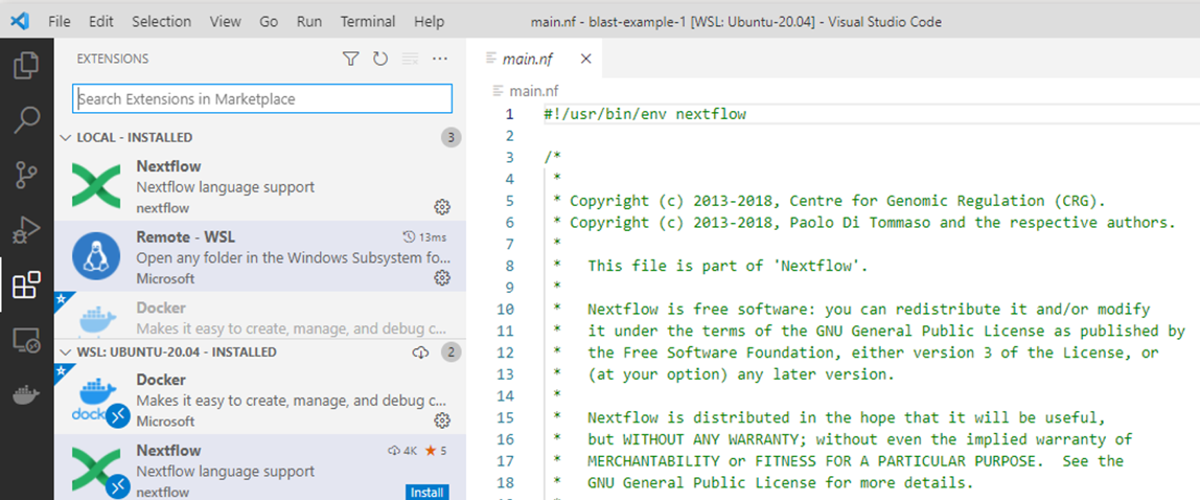 Selecting the Extensions icon, you can see that different VS Code Marketplace extensions run in different contexts. The Nextflow Language extension installed in the previous step is globally available. It works when developing on Windows or developing on WSL: Ubuntu-20.04.