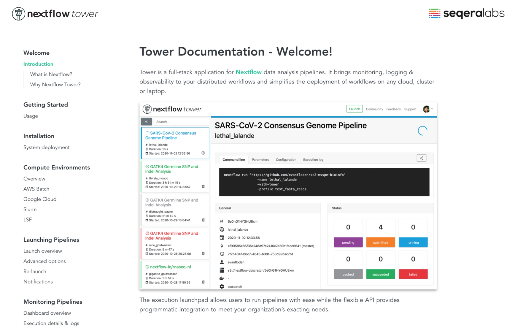 The Tower documentation, available from help.tower.nf, covers an introduction to Tower, getting started and the different usage models. Of particular note are the detailed step-by-step guides for setting up Compute Environments for AWS Batch and Google Cloud Life Sciences.