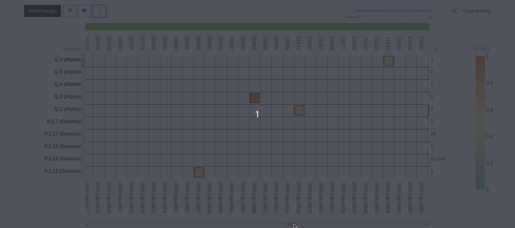 Figure 3. VIRUS-MVP web interface with SARS-CoV-2 sequences grouped into lineages. The central heatmap encodes mutation frequency with functional information available on hover. The bottom histogram shows the distribution of mutations across the genome.