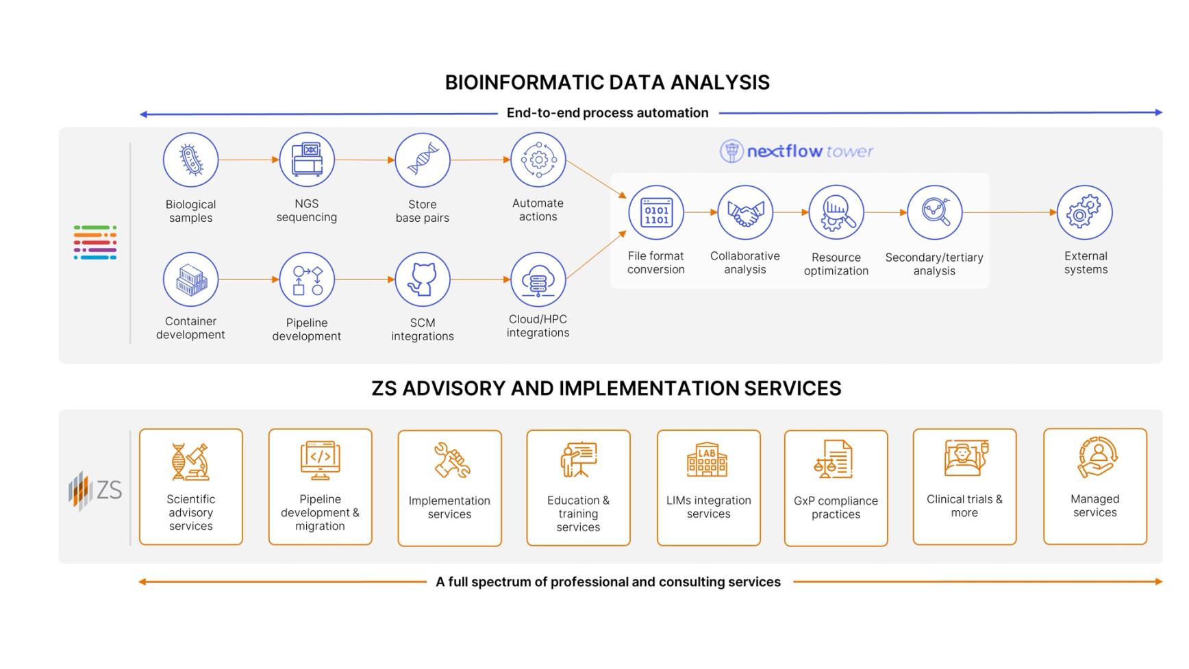 - Leveraging portable, modular pipelines. ZS and Seqera can help streamline development for firms running in-house workflows, rationalizing existing pipelines and making them easier to deploy and manage regardless of the underlying workflow technology. They can also help firms leverage best practices pipelines and modules from [nf-core](https://nf-co.re/) and other open-source community efforts and simplify maintenance by introducing new tools and proven DevOps techniques.
