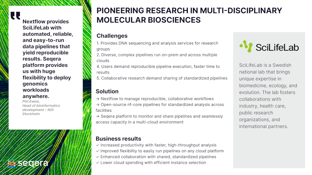 Nextflow and Seqera Platform are used with nf-core pipelines to standardize the genomics analyses for SciLifeLab and other facilities in Sweden. Data pipelines can be run on-premise and in the cloud to maximize throughput and shorten the time to results.